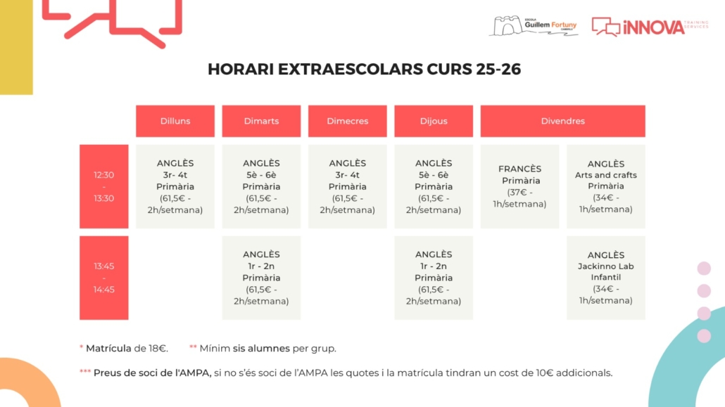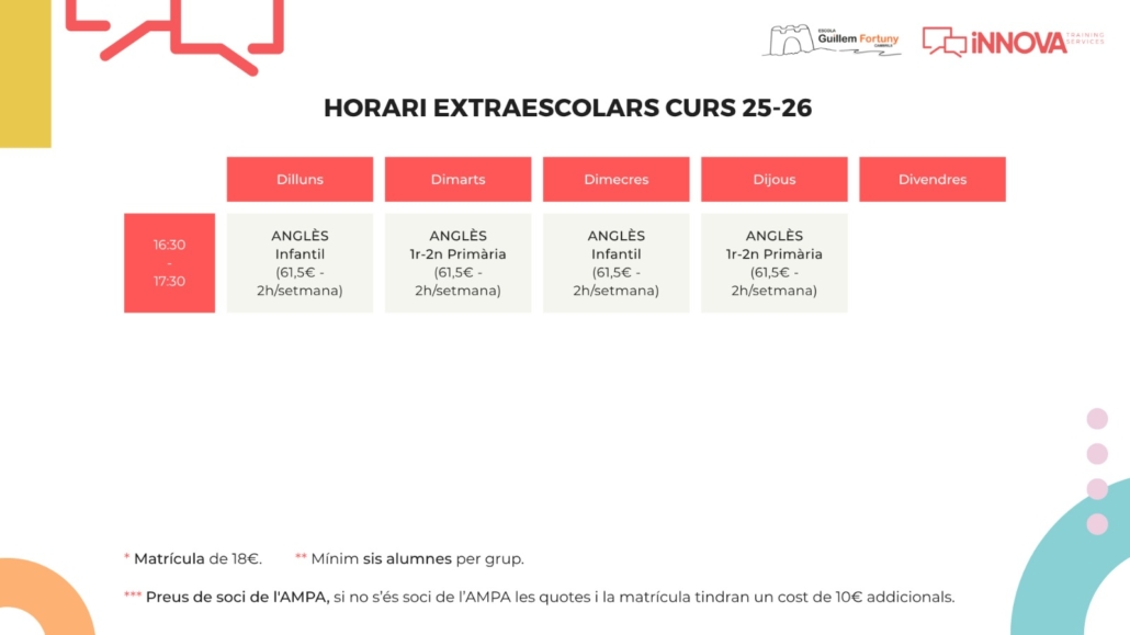 L’Ampa de l’Escola Guillem Fortuny junt amb Escola Innova coordinen l’oferta formativa i el seguiment de totes les activitats extraescolars lingüístiques que es realitzen al centre.