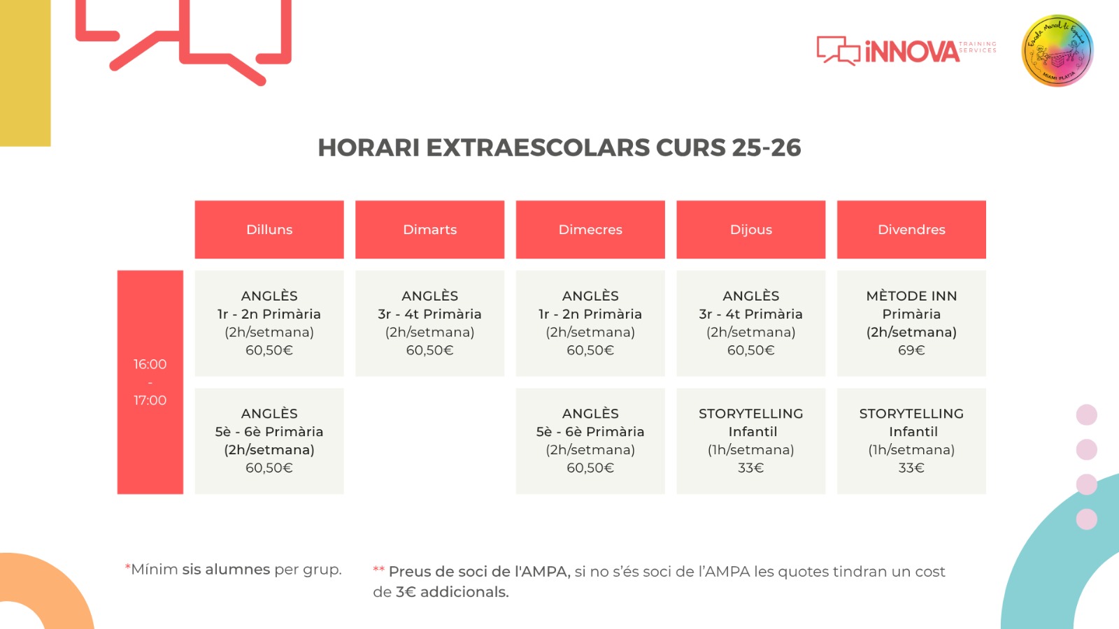 Cada dia, de 9.30 a 12.30 h i de 16.00 a 20.00 h, a les oficines d’Escola Innova.
